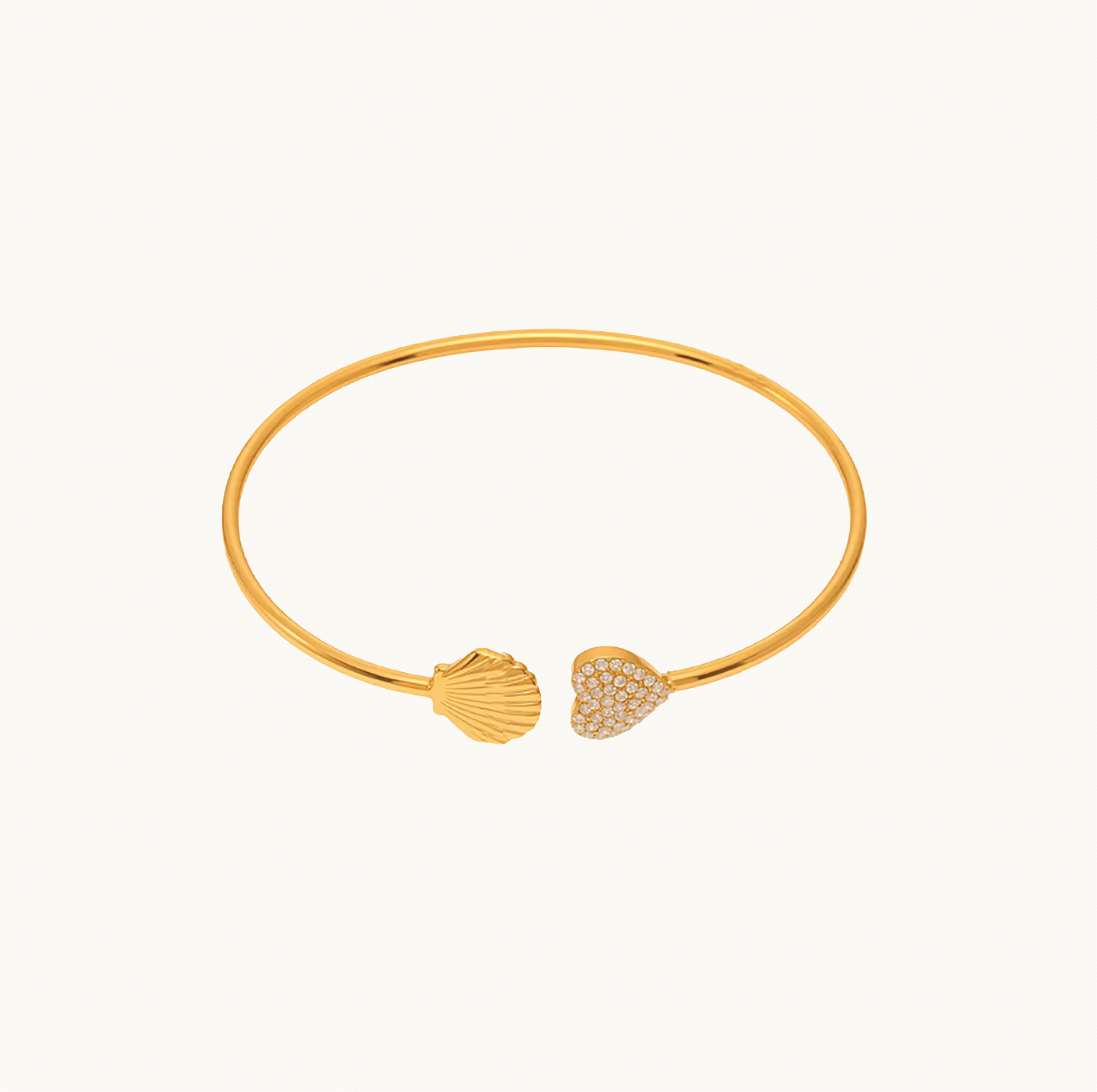 The Coastal Heart Bangle is a piece featuring an enchanting shell and heart design, effortlessly capturing the essence of summer and infusing your style with a refreshing coastal vibe. Crafted with 18k gold plating, it is waterproof, tarnish-resistant, and hypoallergenic, ensuring enduring shine and comfort.