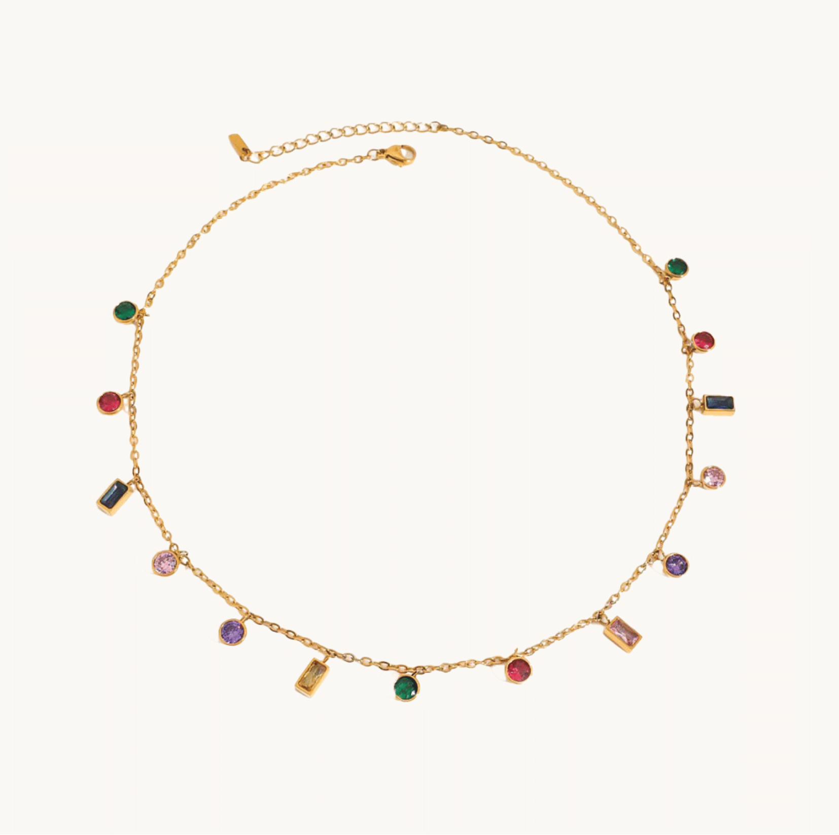 The Multicolor Necklace is a vibrant and playful piece, featuring a mix of colorful stones that add a pop of personality to your look. Crafted with 18k gold plating, it is waterproof, tarnish-resistant, and hypoallergenic, ensuring both durability and comfort. A perfect accessory to brighten up any outfit with a touch of boldness.