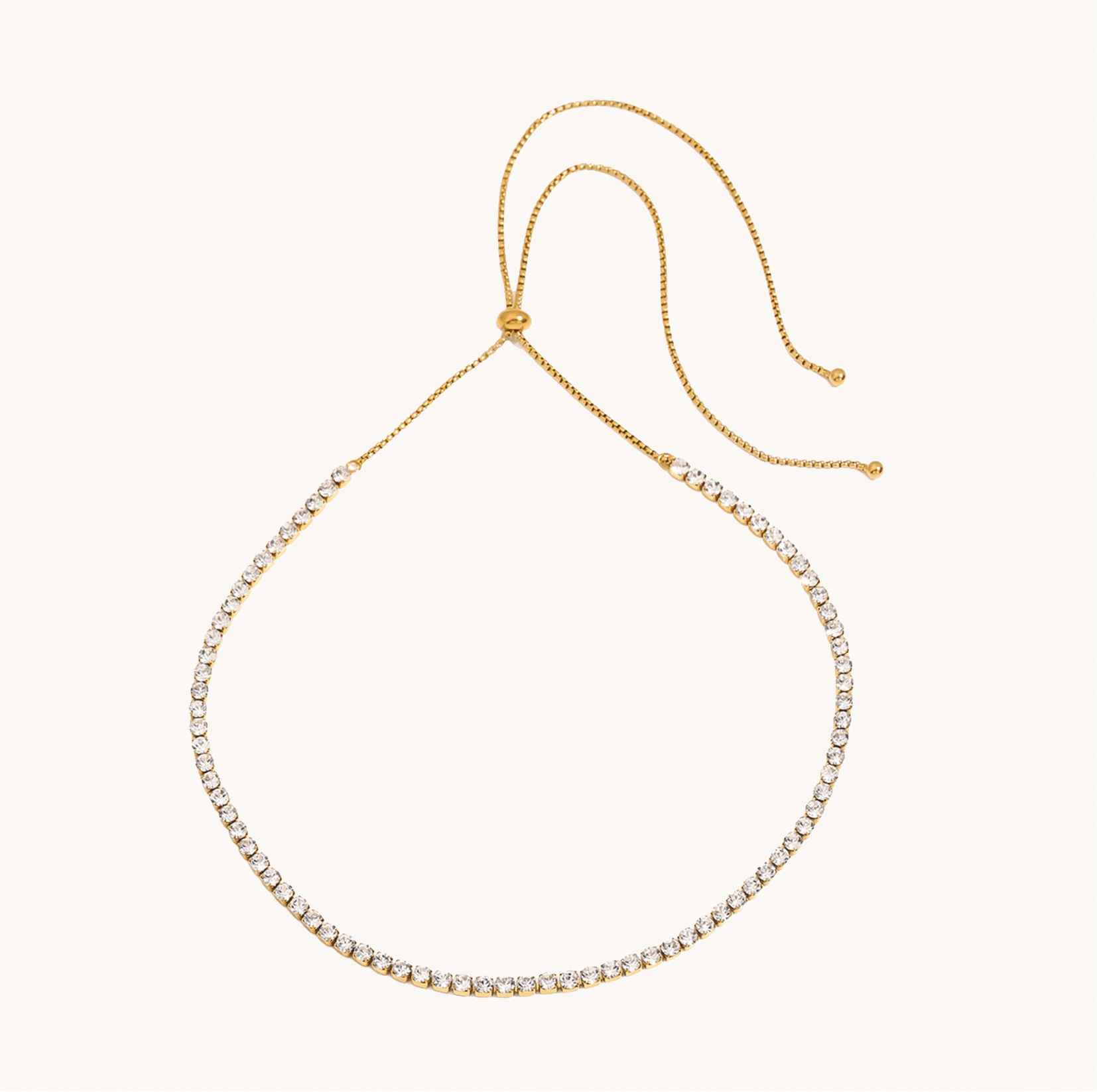The Tennis Necklace showcases a continuous line of sparkling stones, exuding timeless elegance and sophistication. Crafted with 18k gold plating, it is waterproof, tarnish-resistant, and hypoallergenic, ensuring enduring shine and comfort.