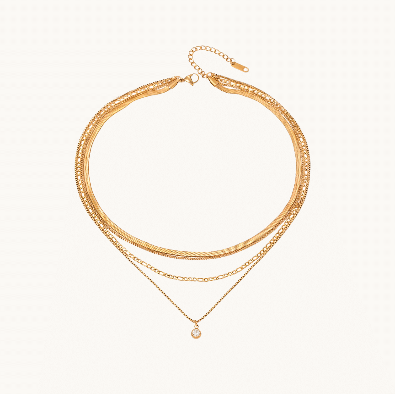The Trinity Layered Necklace is a striking four-layered statement piece, designed to elevate any look. Its versatile design seamlessly pairs with any outfit, adding a touch of sophistication and style. Crafted with 18k gold plating, it is waterproof, tarnish-resistant, and hypoallergenic, ensuring enduring shine and comfort.